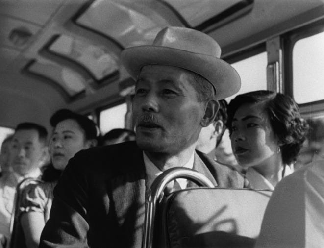 Ozu aprofita el moviment de l’autobús per fer un suau travelling (un moviment de càmera que acompanya el desplaçament), un gest inusual en el seu cinema quiet i contemplatiu.